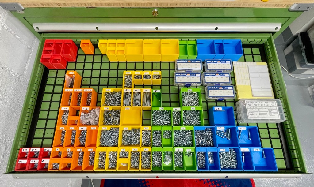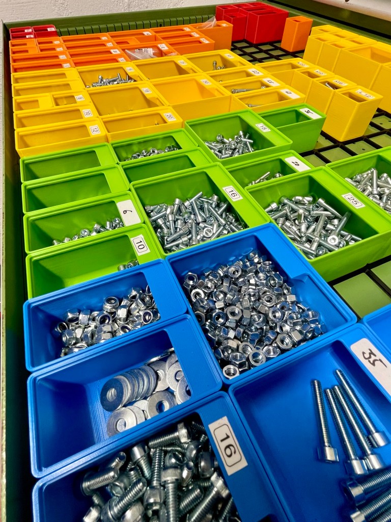 I wanted to have a logical system with visual distinctions to separate the stock of bolts by their metric diameter. For example, all bolts, nuts and washers of size M3 would go together, same with M4, M5, etc. The idea is when you pick an M3 bolt, likely you will need an M3 nut or washer.