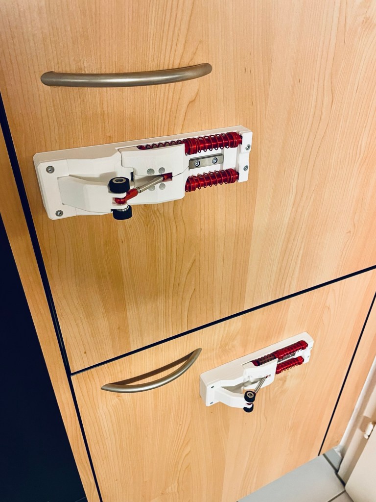 The fridge door of the rented apartment was not mine to drill holes into, so double sided tape was the solution for fixation. Testing it for the first time, I proudly let go of the fridge door to let it cra… bounce into the kitchen door! Yay, it worked …for a couple of days. Then one night while falling asleep I heard a noise that I could not quite place but soon found out it had been the fridge damper hitting the floor. The double sided tape did not hold up to the challenge. Stronger tape fixed it.