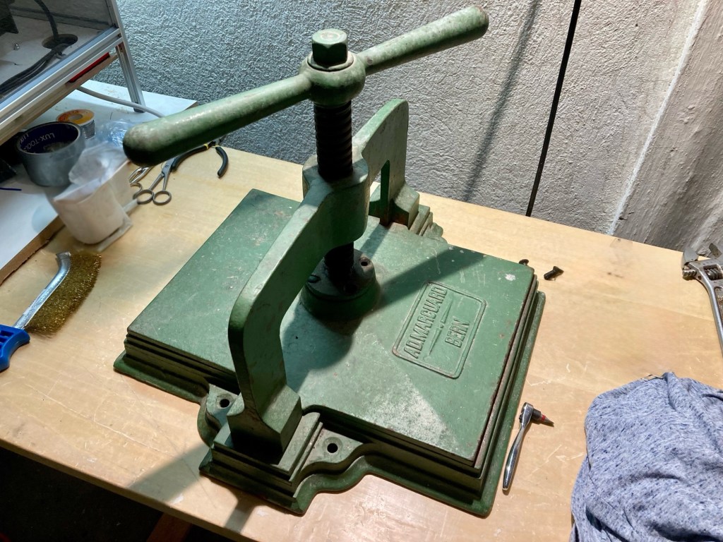 The initial goal was simply to upgrade from clamps to book press and technically I had achieved this with the purchase. But I got the thing home and something happened which often happens: I cannot leave things be as they are (“There ought to be something I can modify here… lemmesee“). I did not like the state of it and decided to restore it and give it a nicer color in the process.