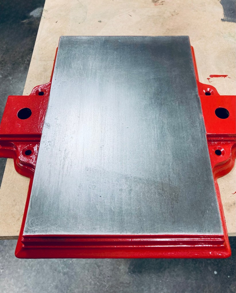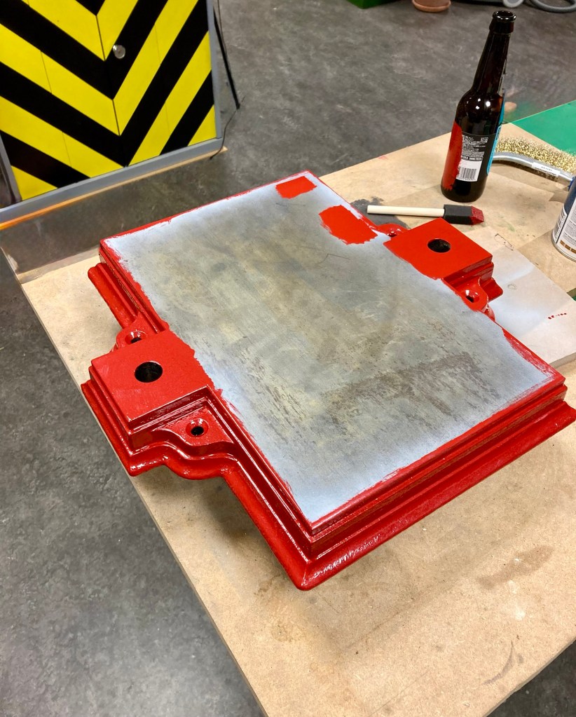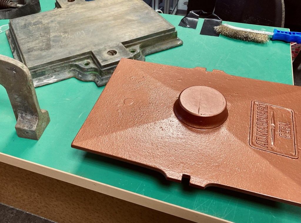 With all the paint gone, some areas took more than one treatment. The first coats of paint went on. I had selected a copper paint, “Hammerschlagfarbe” (ChatGPT translates it to hammer finish paint).
