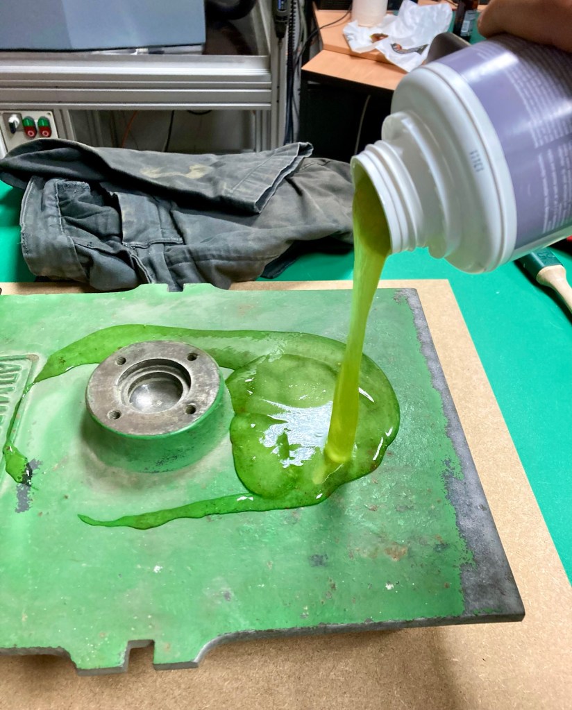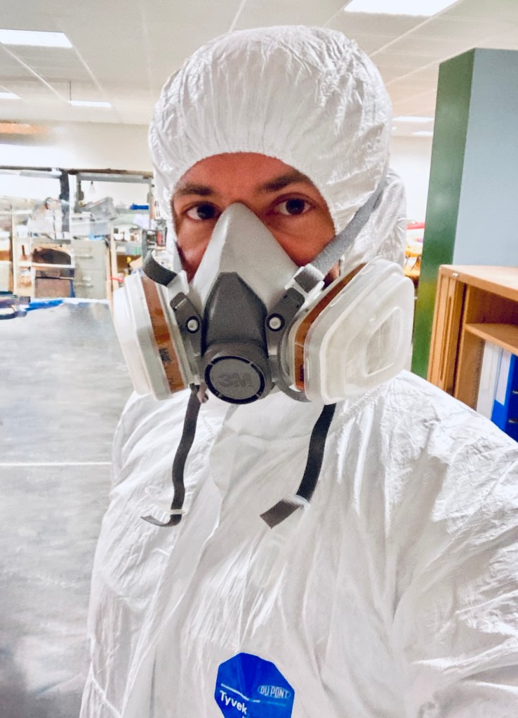 I knew sandblasting would be a mess, even more so without a dedicated cabinet. I made a makeshift sand containment by lining a small room with plastic and donning a full-body suit. The result of all that work was sadly disappointing. The compressor could not keep up with the demand of the cheap gun, and whilst I was able to get some paint off, it took way too long. Also, tons of the sand seemed to end up in my hair somehow. I abandoned that method and went to the next one: green goo. I mean paint stripper. It stinks to high heaven but works very well! The slime-like consistency helps a lot with non-level surfaces where a more runny product would drip.