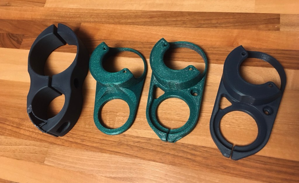 The old instrument cluster was one big chunk. Taking it out meant I had no means of attaching the new speedometer. At first I thought it would be cool to mount it offset from center on the fuel tank. Although I think it would have looked cool, I abandoned the idea. I did not want to peek down too much while riding and take my eyes off the road. The cylinder of the ignition looked like a good place and I got printing. It took a couple of variants until I had a satisfactory design.