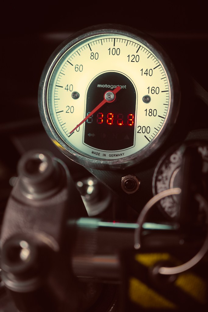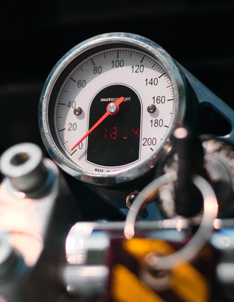 The instrument cluster was replaced by a speedometer combination (motogadget motoscope tiny). The motoscope combines the speedometer with all the indicator lights. Additionally there is a small screen for more info. I never really used the tachometer before. I felt the engine RPM could easily be judged by sound and therefore left it out completely. The only use I ever had from it was the indication of the RPM range where the throttle response was best. This was around 3’300. But again, I don‘t need an instrument for this, I know and feel more or less when I‘m there.