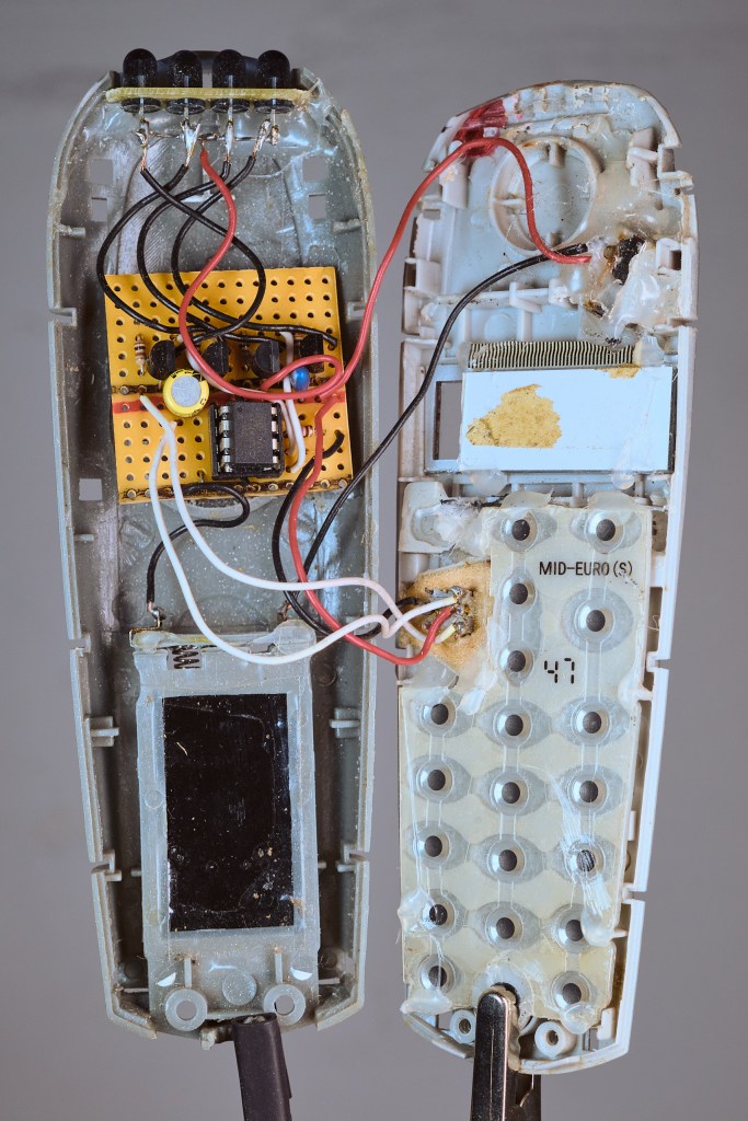 The circuit schematics and the code are openly available on the internet in many variants. Anyone with a soldering iron, access to parts and some creativity can make one themselves. So did I — many years ago. I present to you the not-so-sneaky, somewhat bulky version of a TV-B-Gone hidden in what should have passed as a mobile phone.