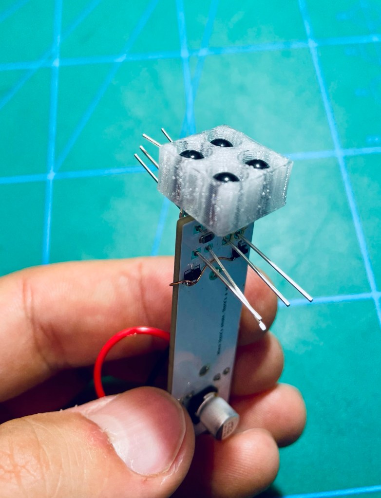 Once I had the main parts and the PCBs in my mailbox I sat down full of excitement for soldering. I got the board ready with all the components up to the microcontroller. This one I would drop in last. A printed positioning tool for the LEDs helped with their alignment for soldering.