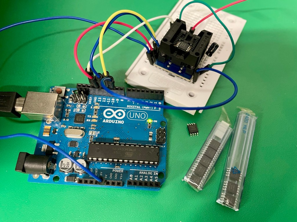 The microcontroller programming gave me a lot of trouble and I spent the better part of an entire Saturday just trying to get a connection. Finally I managed. What helped a lot in the troubleshooting process was having multiple Arduinos at hand. Since I could not get my PC to recognize the usual programmer, I used an Arduino configured as a programmer with one of the example sketches available in the Arduino IDE. Another indispensable tool in this process is an SMD/DIL adapter for the microcontroller. It‘s great for programming and troubleshooting.
