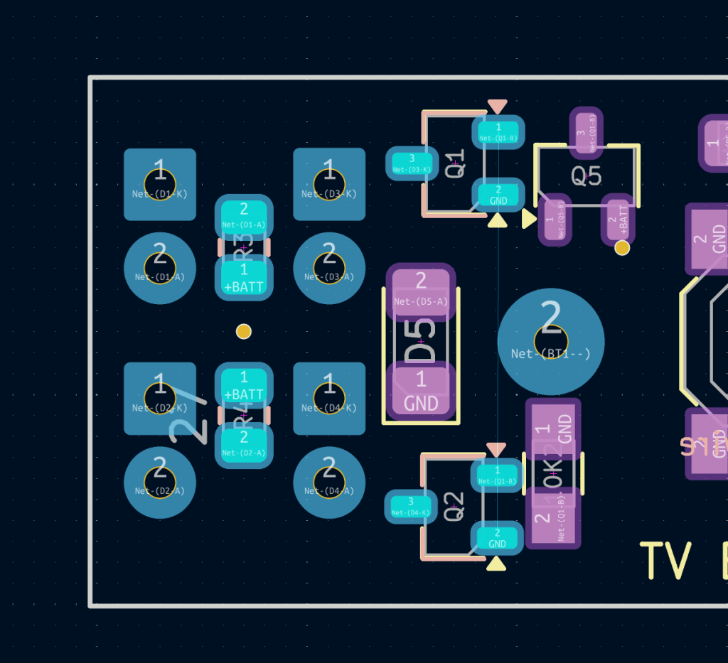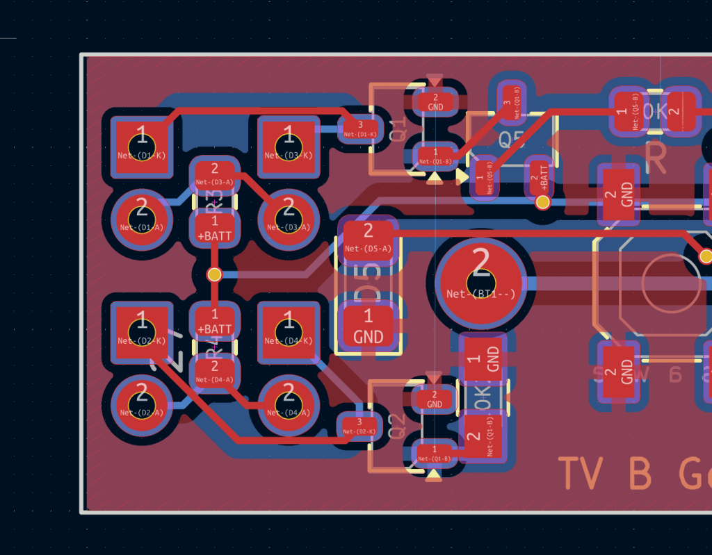 When I started the project I ordered parts to make 10 with the thought to give them away to friends and family. I got the first unit to work but was not going to go through the trouble of the same enamel wire hot fix with the remaining units. PCB design is just too easy and affordable for this. So the board designer was fired up again to fix the error, along with other small improvements. During soldering I noticed how helpful silkscreen information can be. I had to go back to the schematic often to check which resistor value goes where (or to put in a battery without releasing magic smoke). Having this information on the board makes a lot more sense. Normally it already is, I had removed it to get a cleaner look of the board. Since no one is ever going to see it anyway, back came the numbers.