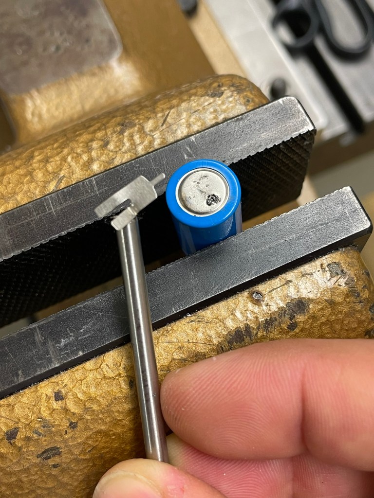 - Welding the battery tabs on the cells took some tries. I had access to a spot welding machine at work but for some reason it was really good at welding the tab to the stick itself but not the battery. It was also a bit too clunky for those small cells. I remembered seeing something similar on Ali and searched for it again. It was like $10 – totally worth a try. The device has to be put on the highest setting for a solid weld, it‘s not exactly overpowered. But it got the job done. In between the first fail and receiving the Ali-spot welder I tried soldering the tabs. This worked but I think spot welding is the more suitable method.