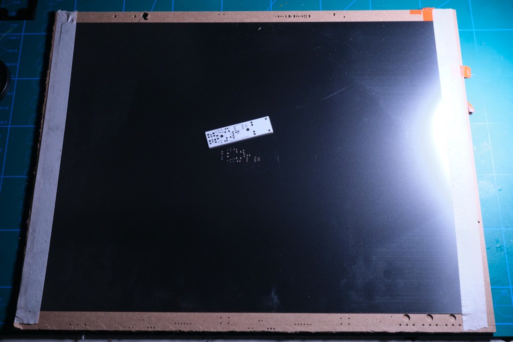 The surprise was its size. Compared to the tiny PCB, the stencil is huge. I wonder how this is done normally, if there are standard sizes for stencils and what machines they go into.