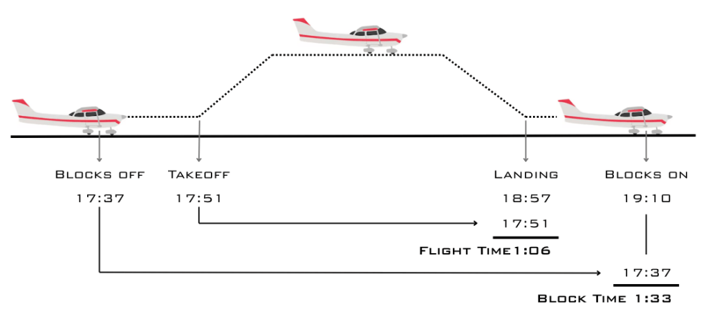 So a flight generates four timestamps. In sequence, they are blocks off, takeoff, landing and blocks on. The difference between blocks off / on is the block time, the difference between takeoff and landing is the flight time. The pilot enters the block time into his pilot‘s logbook as flight experience and flight time is entered into the aircraft logbook.