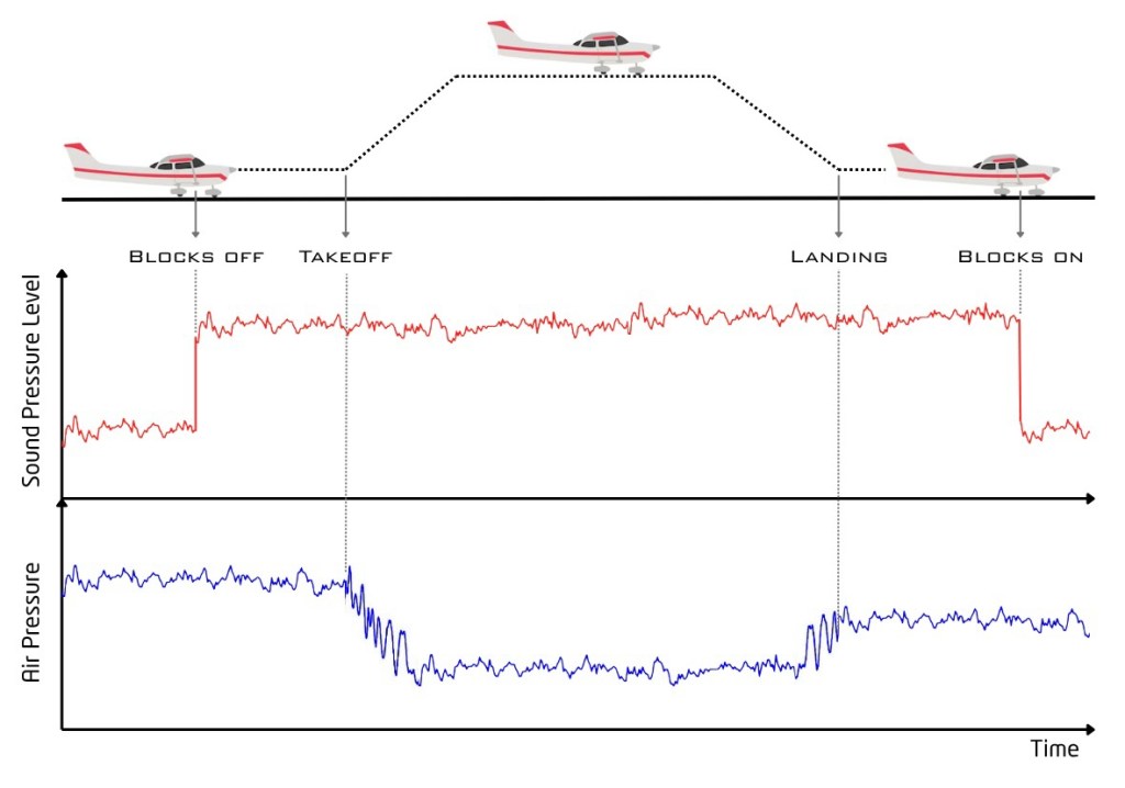 The takeoff and landing times I intended to grab with a barometric air-pressure sensor and software logic. The drop in air pressure after takeoff would certainly be easy to pick out from the readings and the last change in air pressure before the engine is turned off should be equally simple to spot in the data as landing time.