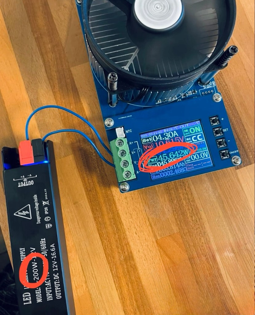 The code was written, the connections were made; it was time for testing. The cold side got cold and the hot side got hot, but far too slowly and far too little. Well, okay, maybe it would just take some time to get going….No, it just did not have enough power. Ha! Of course! Sometimes my friend Ali sends me sub-quality parts and most likely the power supply did not quite live up to its promise. The power meter confirmed my suspicion. Under load, the power supply failed miserably and did not deliver the advertised power – not even a quarter of the stated value! Another one delivered a bit more than half.