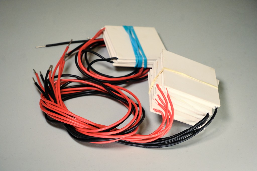 I have not lost the fascination for Peltiers, though. If you have made it to this point and still think Peltier elements are not the bee‘s knees, consider this: They work in reverse too! Jaja, so if you heat one side and keep the other side cool, it will generate a voltage. Then they are called TEGs, thermoelectric generators, but it‘s the same thing. The reason why not everyone and their uncle is using them for everything is that they are abysmally inefficient. In the heat pump configuration you can expect 5-10% efficiency; in the TEG mode it’s somewhere at 2-5%.