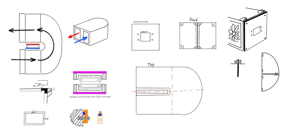 Below are some design sketches for the air duct surrounding the Peltier and temperature sensor attachment.