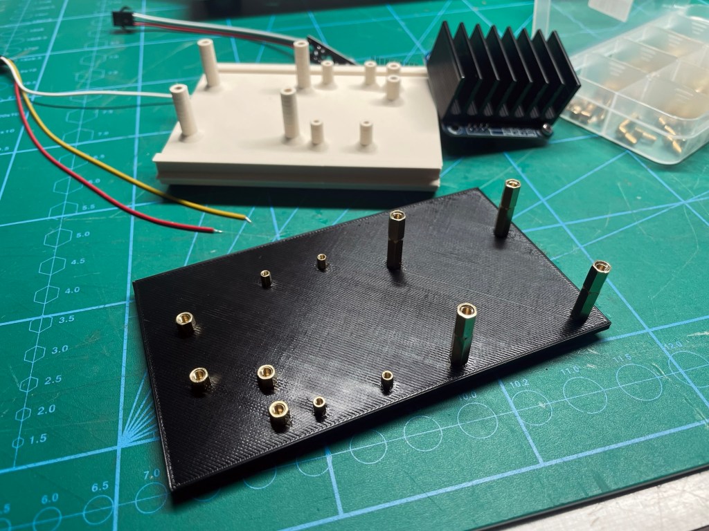 I printed a couple of versions of UM 72 inserts to take the motor driver, the RS485 converter, the RPM sensor (or what‘s left of it) and a logic level shifter. First, the mounting posts were printed as well and then I remembered that the usual brass hex standoffs would be much more fitting.