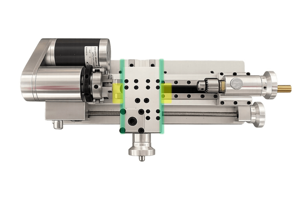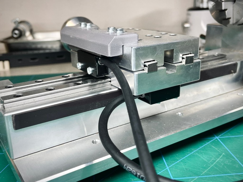 In theory, the X-axis read head could go on the left or right side of the carriage (green lines) but in practise only the right side makes sense. This way, I lose a bit of travel distance of the tailstock, but it is much better than interfering with the spindle and getting rained on by chips and cutting fluid on the left side. For the placement of the threaded holes I had much more margin of error, because any error in distance I could later easily correct with the 3D printed magnetic tape carrier. Just as long as the read head remained parallel to the magnetic tape.